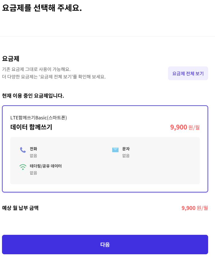 기존 데이터함께쓰기용으로 개통한 정보를 입력.