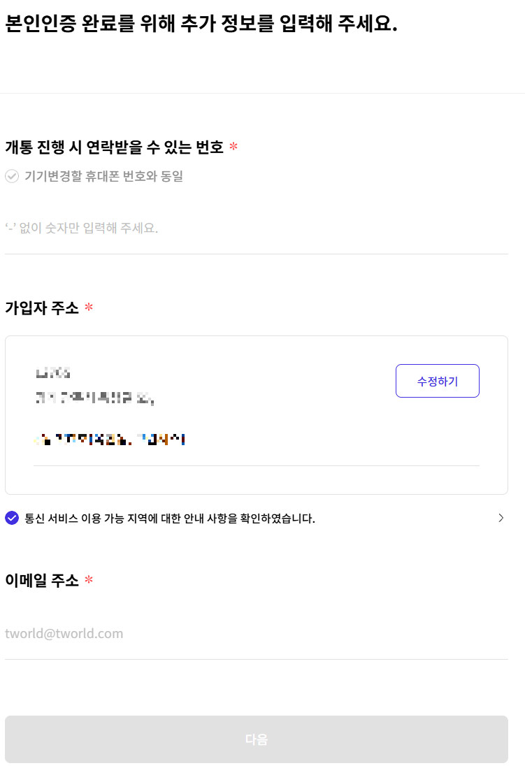 개통 진행시 연락받을 수 있는 번호는 메인번호를 입력함.