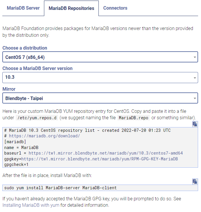 baseurl = https://tw1.mirror.blendbyte.net/mariadb/yum/10.3/centos7-amd64