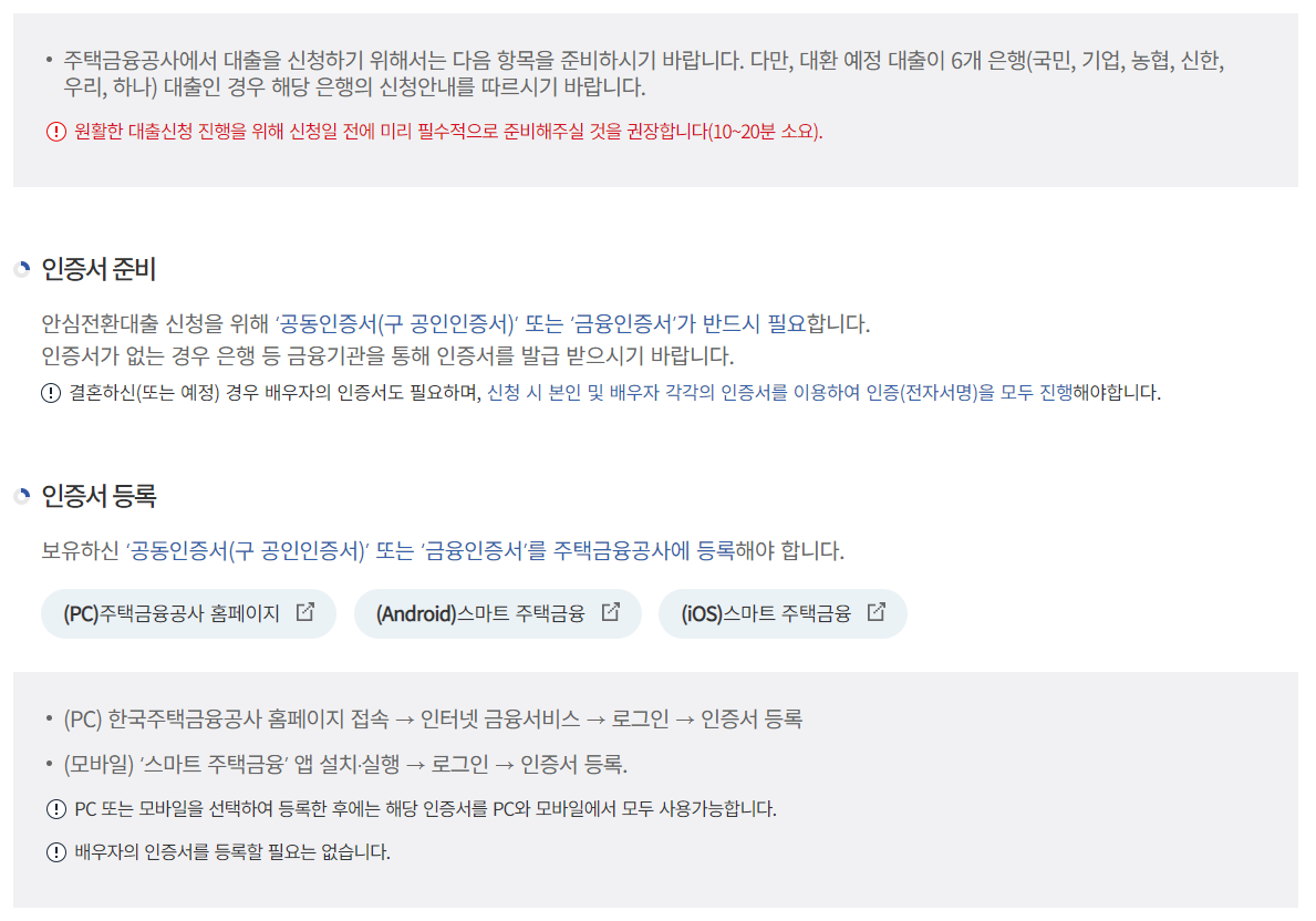 기존 대출이 6대 은행(국민, 기업, 농협, 신한, 우리, 하나) 대출인 경우 해당 은행 창구 또는 온라인으로 신청하고, 기존 대출이 그 외 은행 및 2금융권 대출인 경우 공사 홈페이지(hf.go.kr) 또는